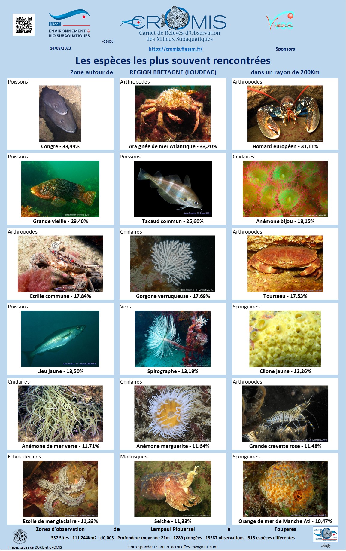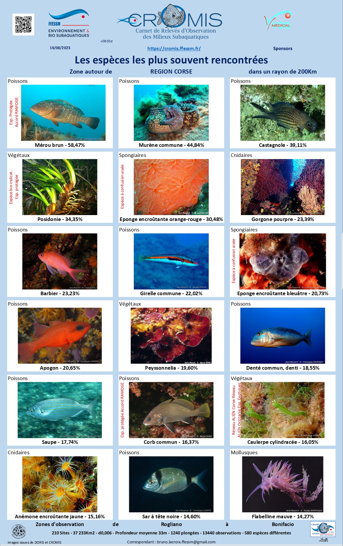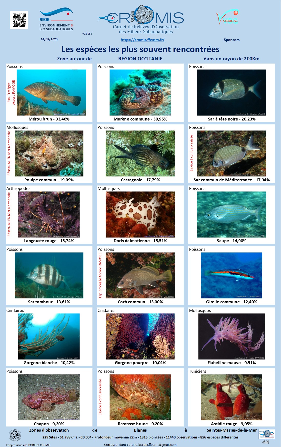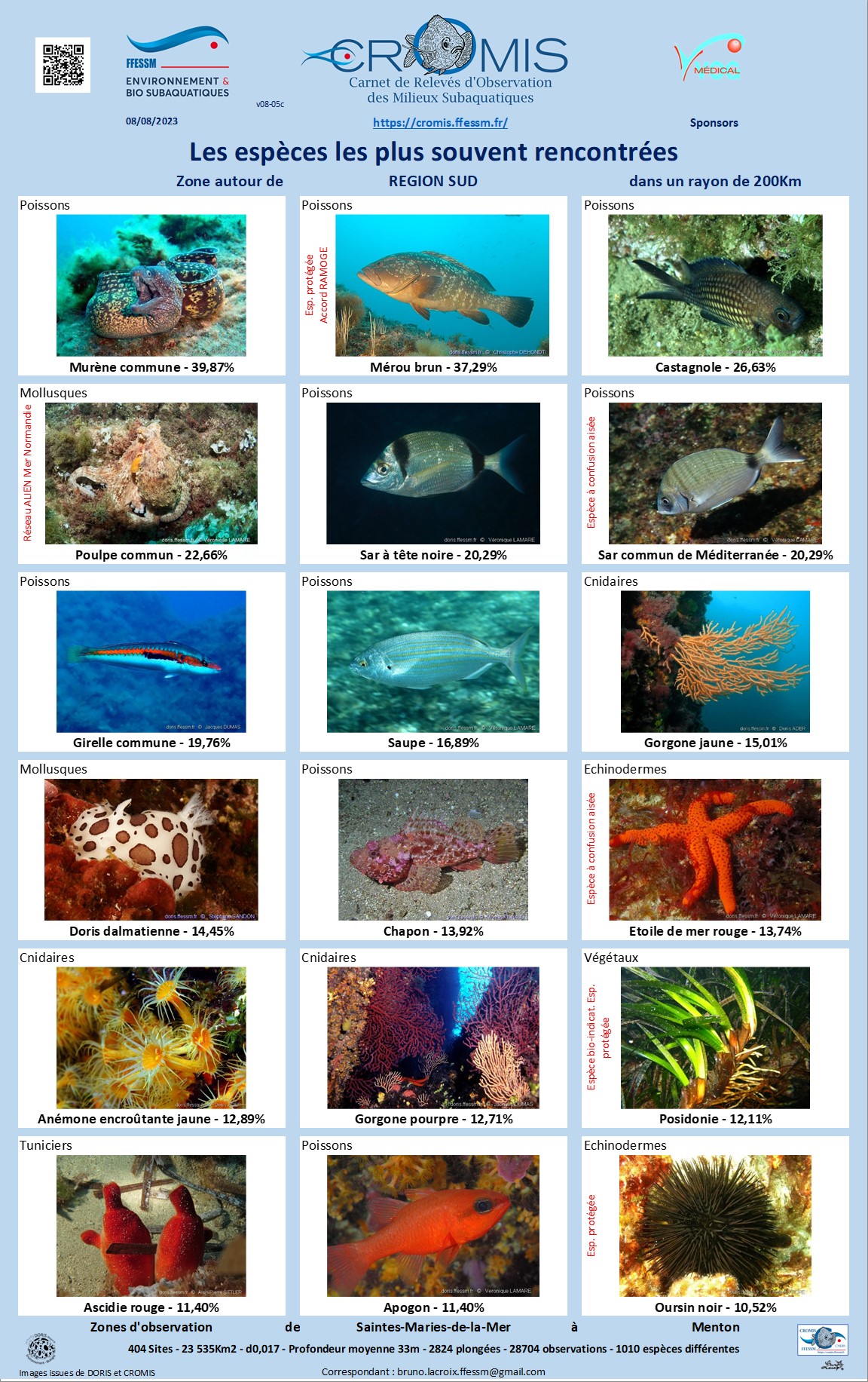 Le correspondant CROMIS de la région SUD, Bruno LACROIX, a composé, à partir des données renfermées dans la base de données de CROMIS, des fiches et des posters par région ou sous-région, montrant les espèces et les sites de plongée de chaque zone.