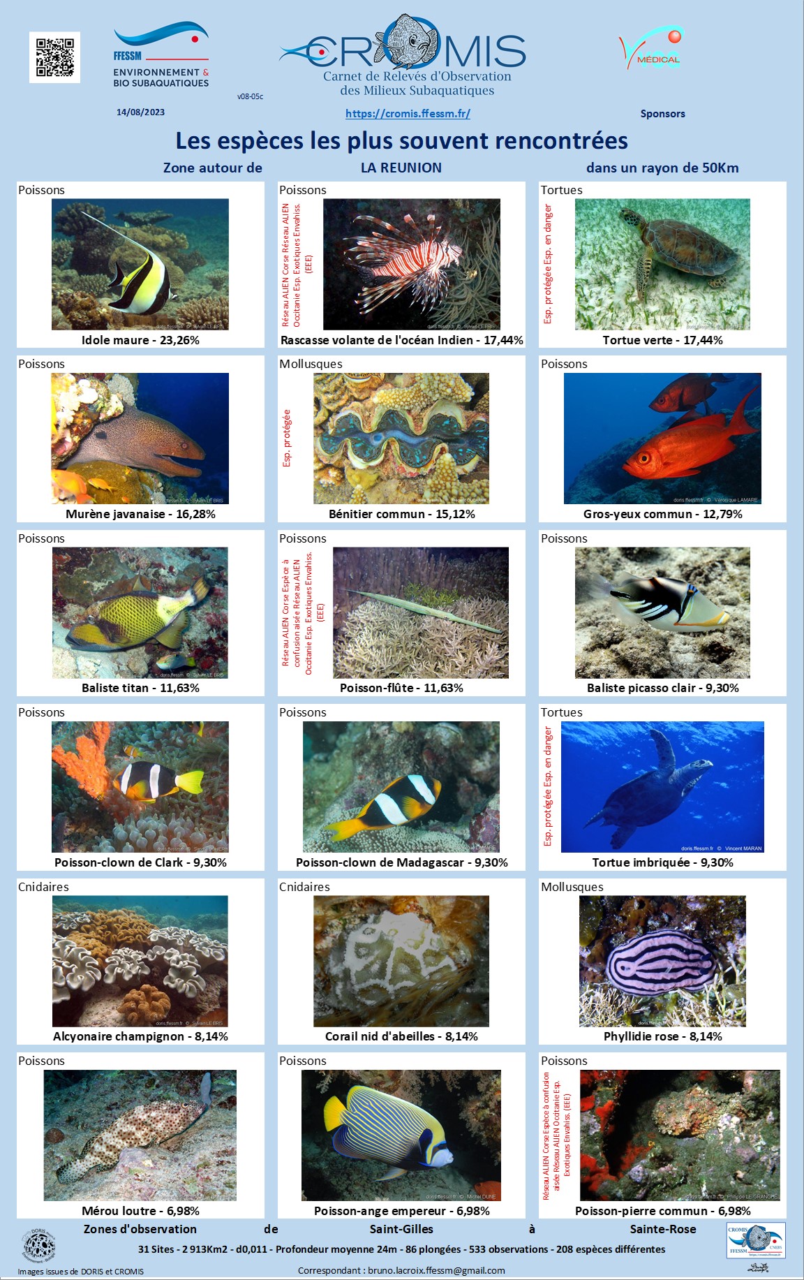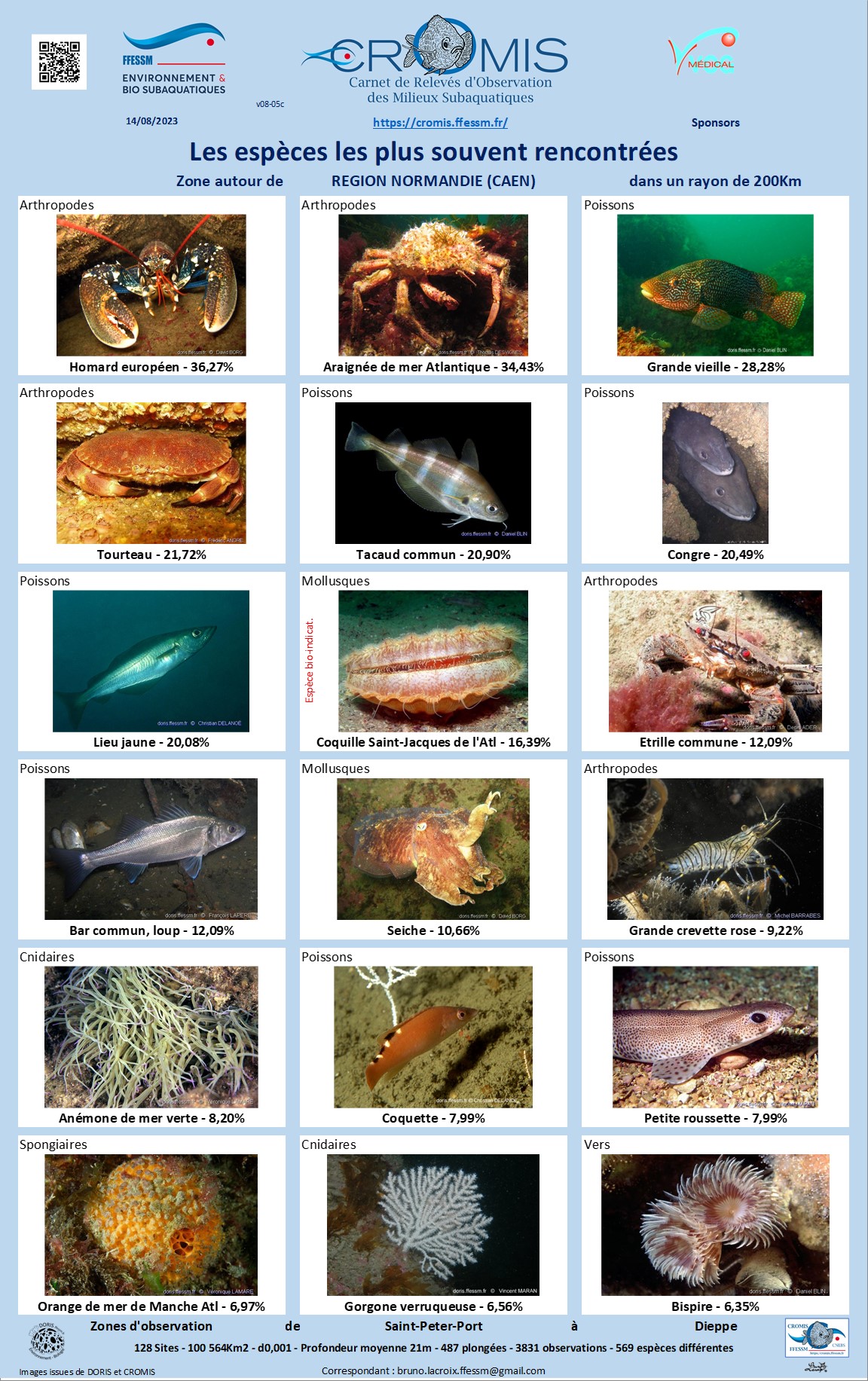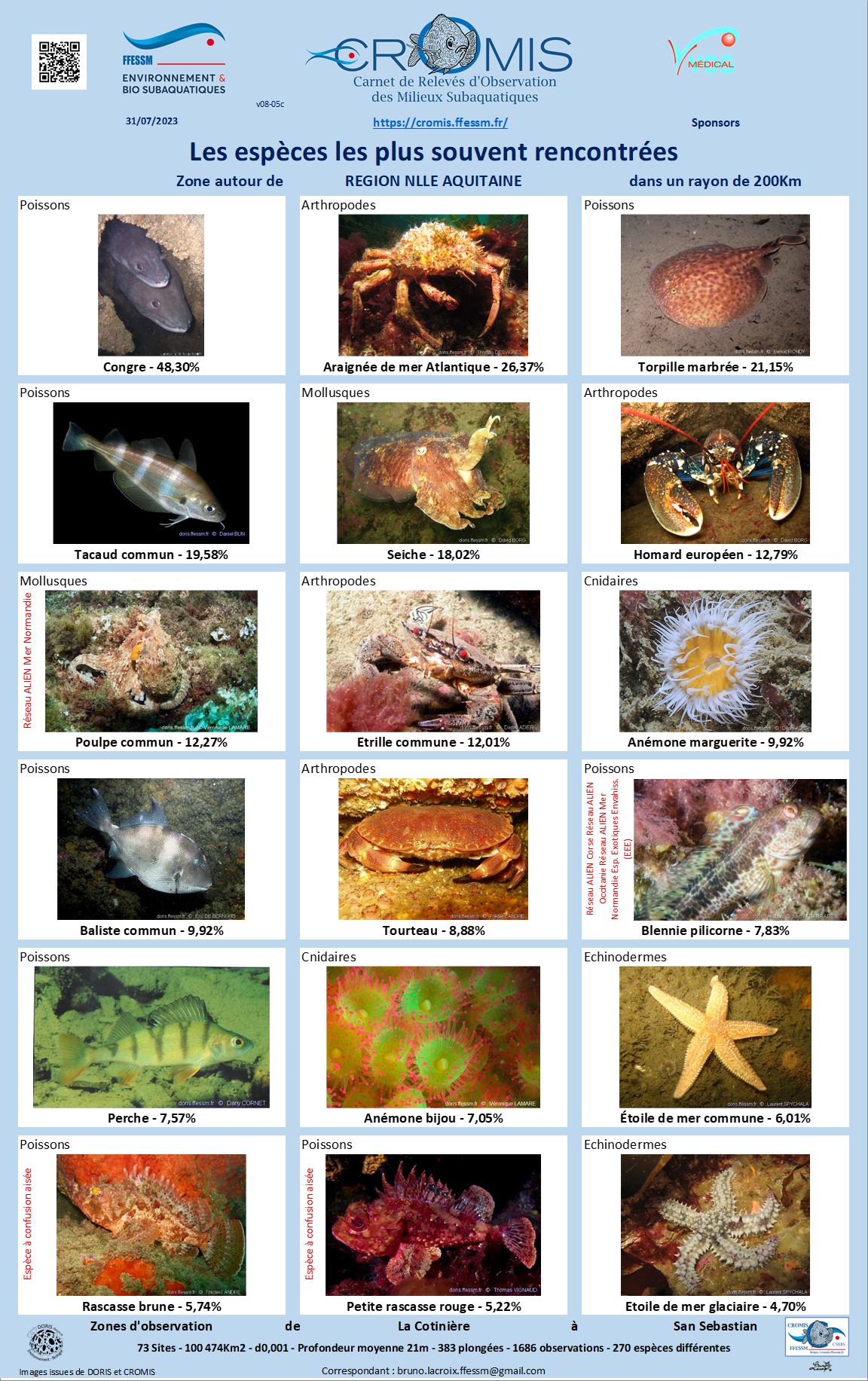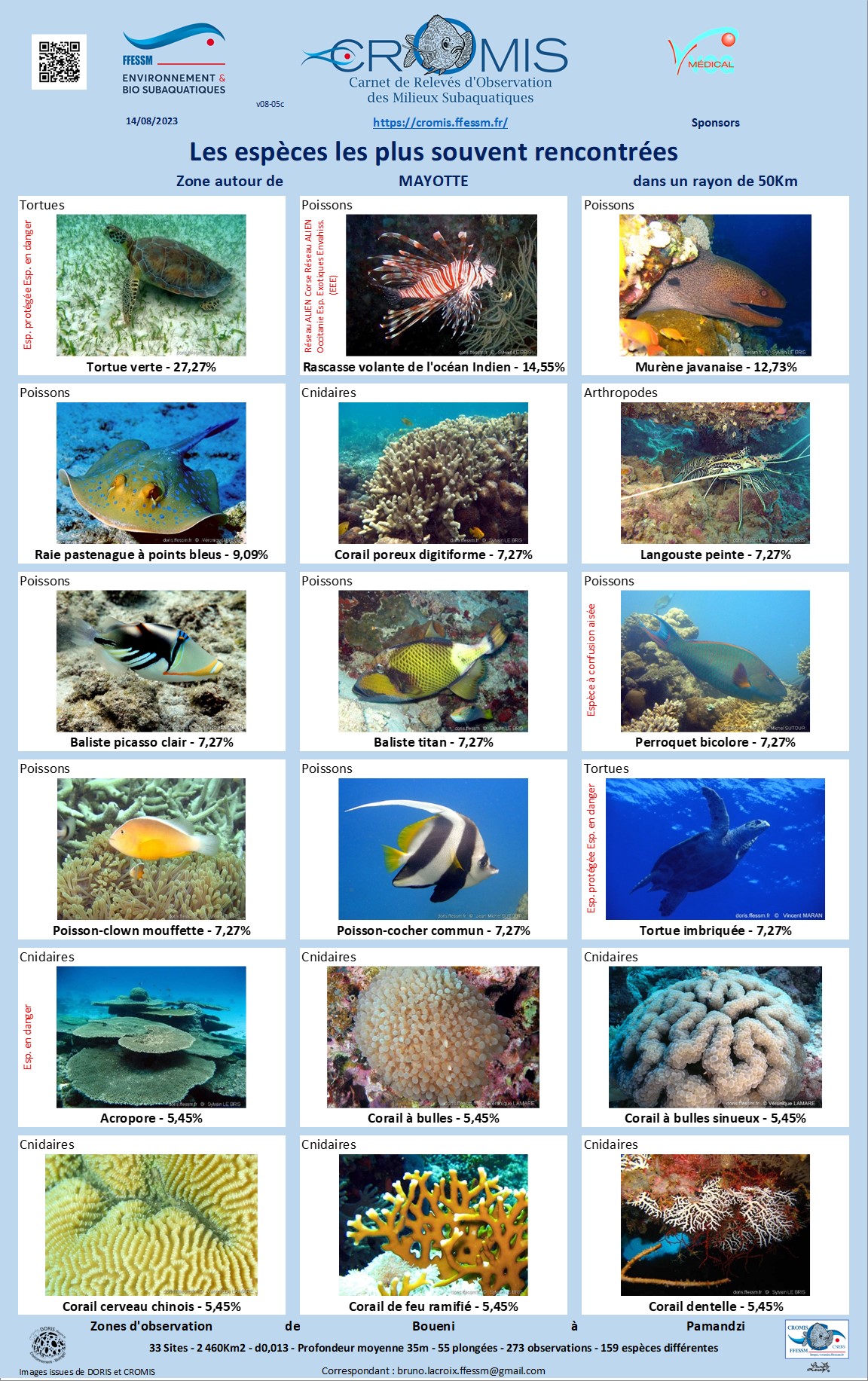 Le correspondant CROMIS de la région SUD, Bruno LACROIX, a composé, à partir des données renfermées dans la base de données de CROMIS, des fiches et des posters par région ou sous-région, montrant les espèces et les sites de plongée de chaque zone.